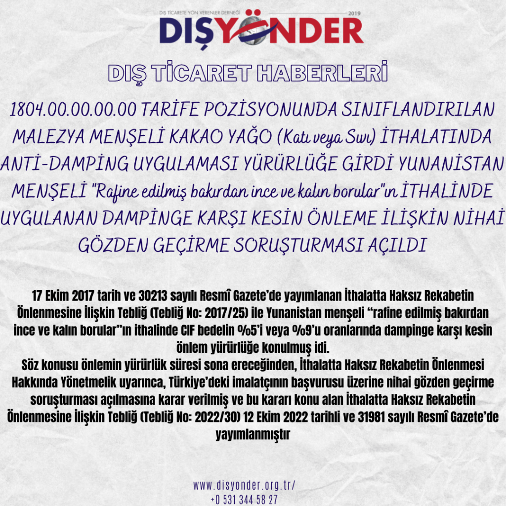 1804.00.00.00.00 TARİFE POZİSYONUNDA SINIFLANDIRILAN MALEZYA MENŞELİ KAKAO YAĞO (Katı veya Sıvı) İTHALATINDA ANTİ-DAMPİNG UYGULAMASI YÜRÜRLÜĞE GİRDİ YUNANİSTAN MENŞELİ “Rafine edilmiş bakırdan ince ve kalın borular”ın İTHALİNDE UYGULANAN DAMPİNGE KARŞI KESİN ÖNLEME İLİŞKİN NİHAİ GÖZDEN GEÇİRME SORUŞTURMASI AÇILDI