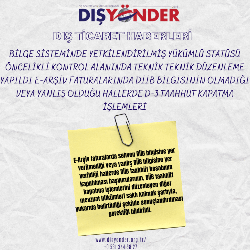 BİLGE SİSTEMİNDE YETKİLENDİRİLMİŞ YÜKÜMLÜ STATÜSÜ ÖNCELİKLİ KONTROL ALANINDA TEKNİK TEKNİK DÜZENLEME YAPILDI E-ARŞİV FATURALARINDA DİİB BİLGİSİNİN OLMADIĞI VEYA YANLIŞ OLDUĞU HALLERDE D-3 TAAHHÜT KAPATMA İŞLEMLERİ
