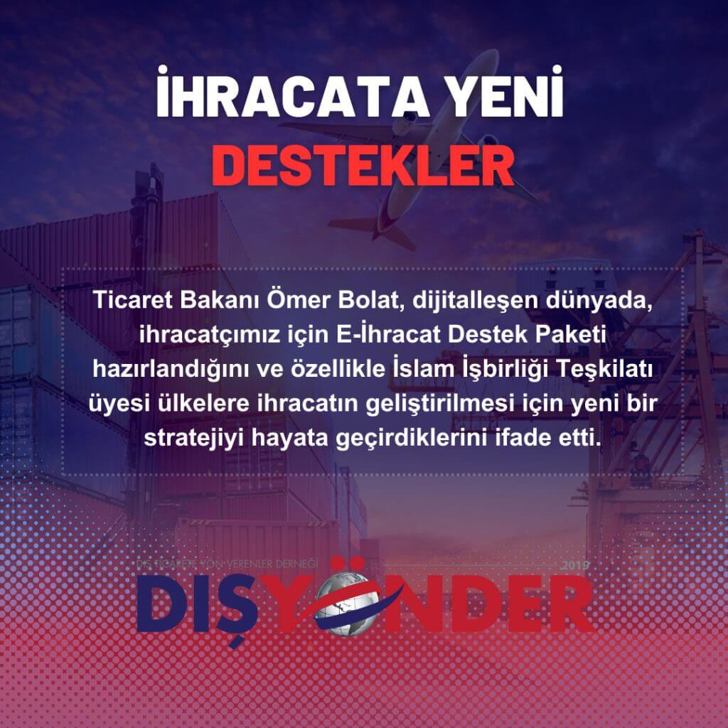 İhracata yeni destekler Ticaret Bakanı Ömer Bolat, dijitalleşen dünyada, ihracatçımız için E-İhracat Destek Paketi hazırlandığını ve özellikle İslam İşbirliği Teşkilatı üyesi ülkelere ihracatın geliştirilmesi için yeni bir stratejiyi hayata geçirdiklerini ifade etti.
