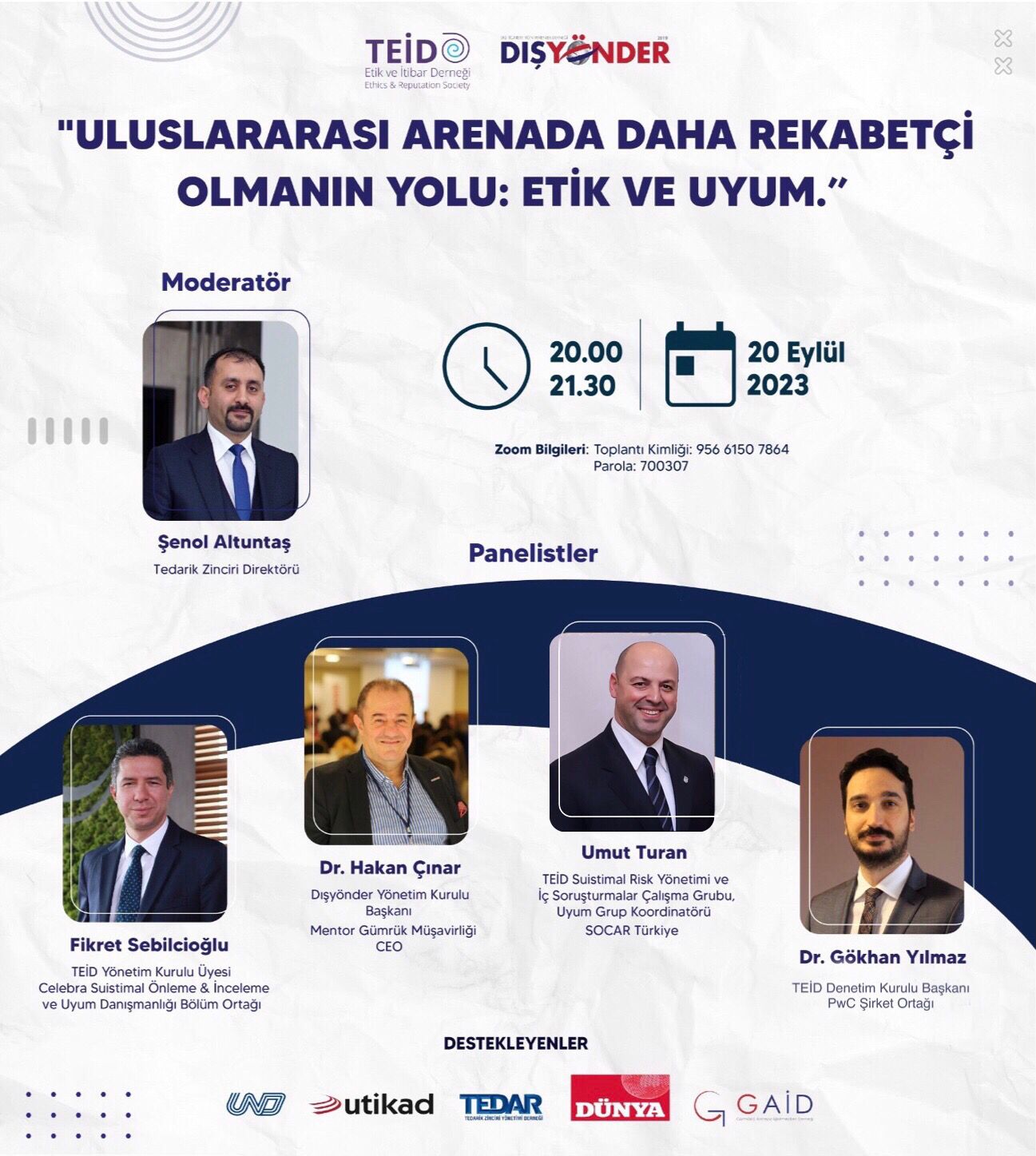 Etik ve İtibar Derneği ve DIŞYÖNDER olarak çevrimiçi düzenleyeceğimiz “Uluslararası Arenada Daha Rekabetçi Olmanın Yolu: Etik ve Uyum” panelinde, siz değerli paydaşlarımızla, üst yönetimin dürüstlüğe ve etik ilkelere yaklaşımını, çıkar çatışmalarının doğasını ve bildirim politikaları ile dile getirme kültürünü konuşmayı ve ülke olarak etik ve uyum yolcuğunda nerede olduğumuzu tartışmayı planlıyoruz.