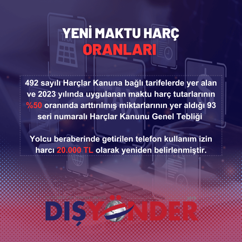 Yeni Maktu Harç Oranları 492 sayılı Harçlar Kanuna bağlı tarifelerde yer alan ve 2023 yılında uygulanan maktu harç tutarlarının %50 oranında arttırılmış miktarlarının yer aldığı 93 seri numaralı Harçlar Kanunu Genel Tebliği Yolcu beraberinde getirilen telefon kullanım izin harcı 20.000 TL olarak yeniden belirlenmiştir.